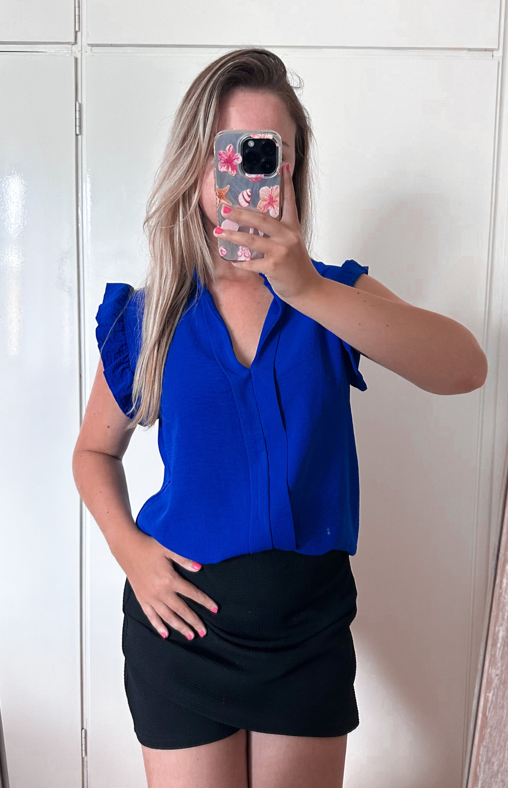 Hoe leuk is deze blouse! Het heeft een v-hals en hele korte mouwtjes. Heerlijke blouse voor de zomer en leuk te combineren met onze zwarte koko short! Ook in de kleuren roze, beige en zwart. De blouse is een one size en draagbaar tot en met maat L