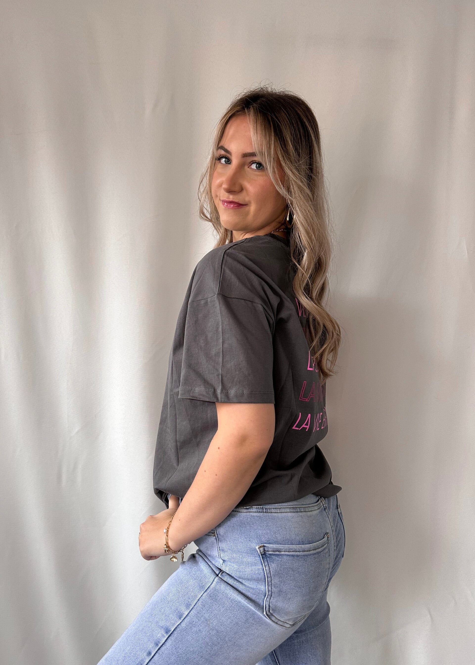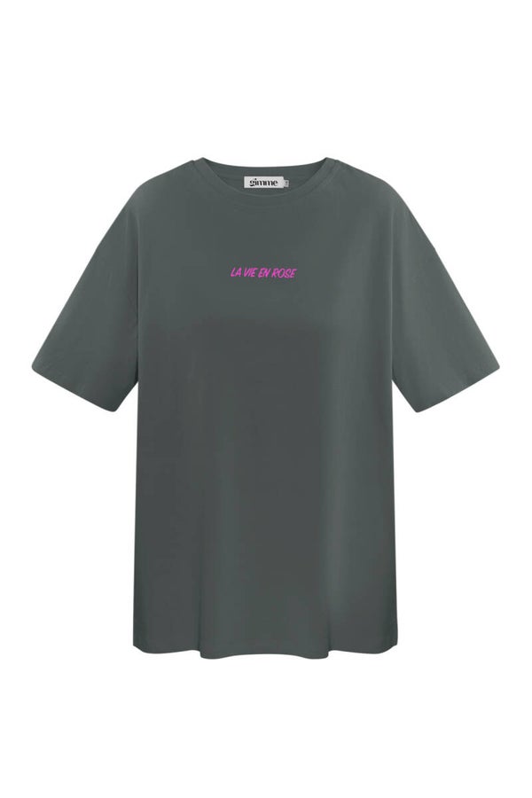 Dit leuke T-shirt is heel leuk te combineren met spijkerbroek.Het heeft de tekst ' La vie en rose' op de achterkant staan en middenvoor. Het shirt heeft een beetje een oversized look.