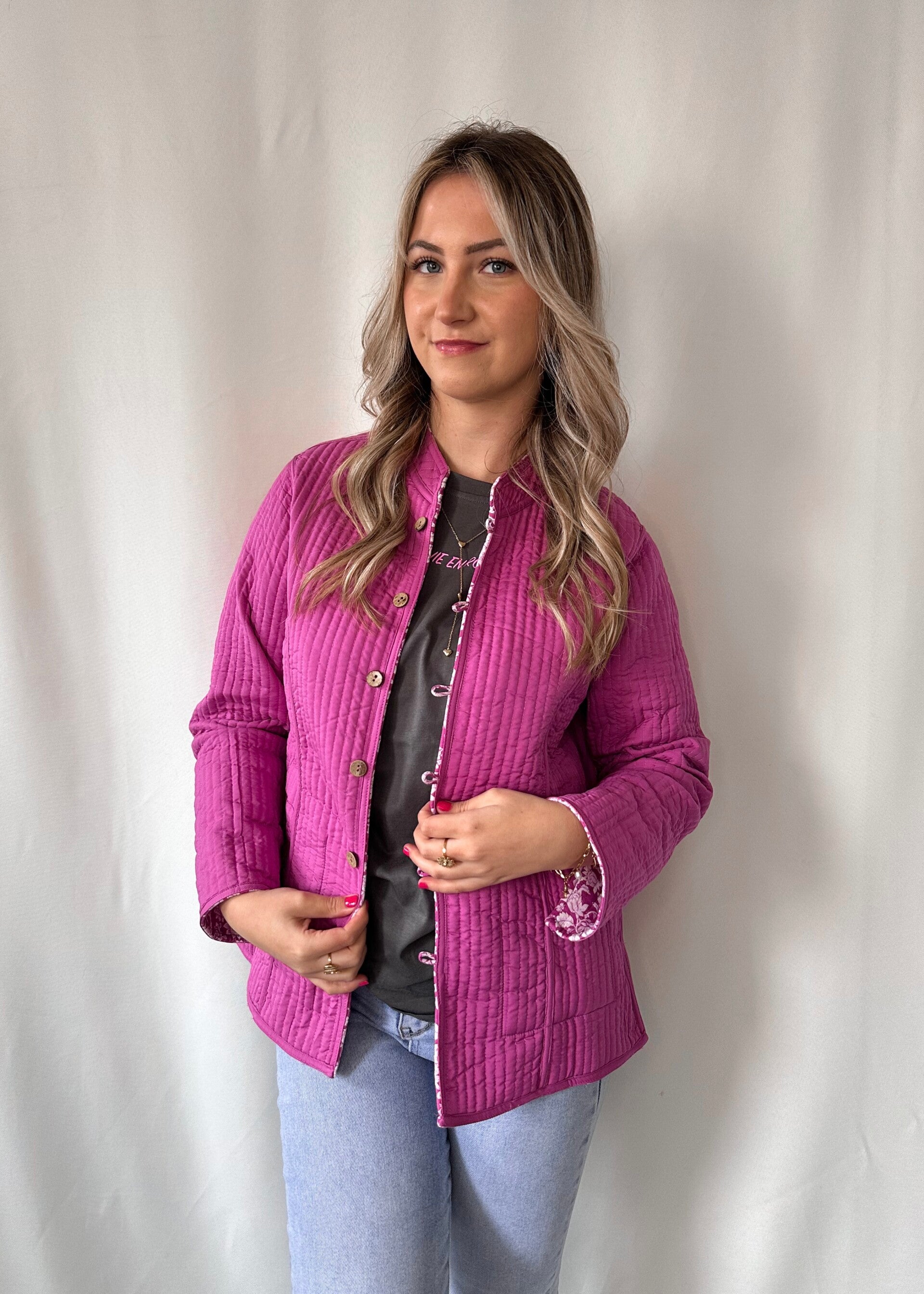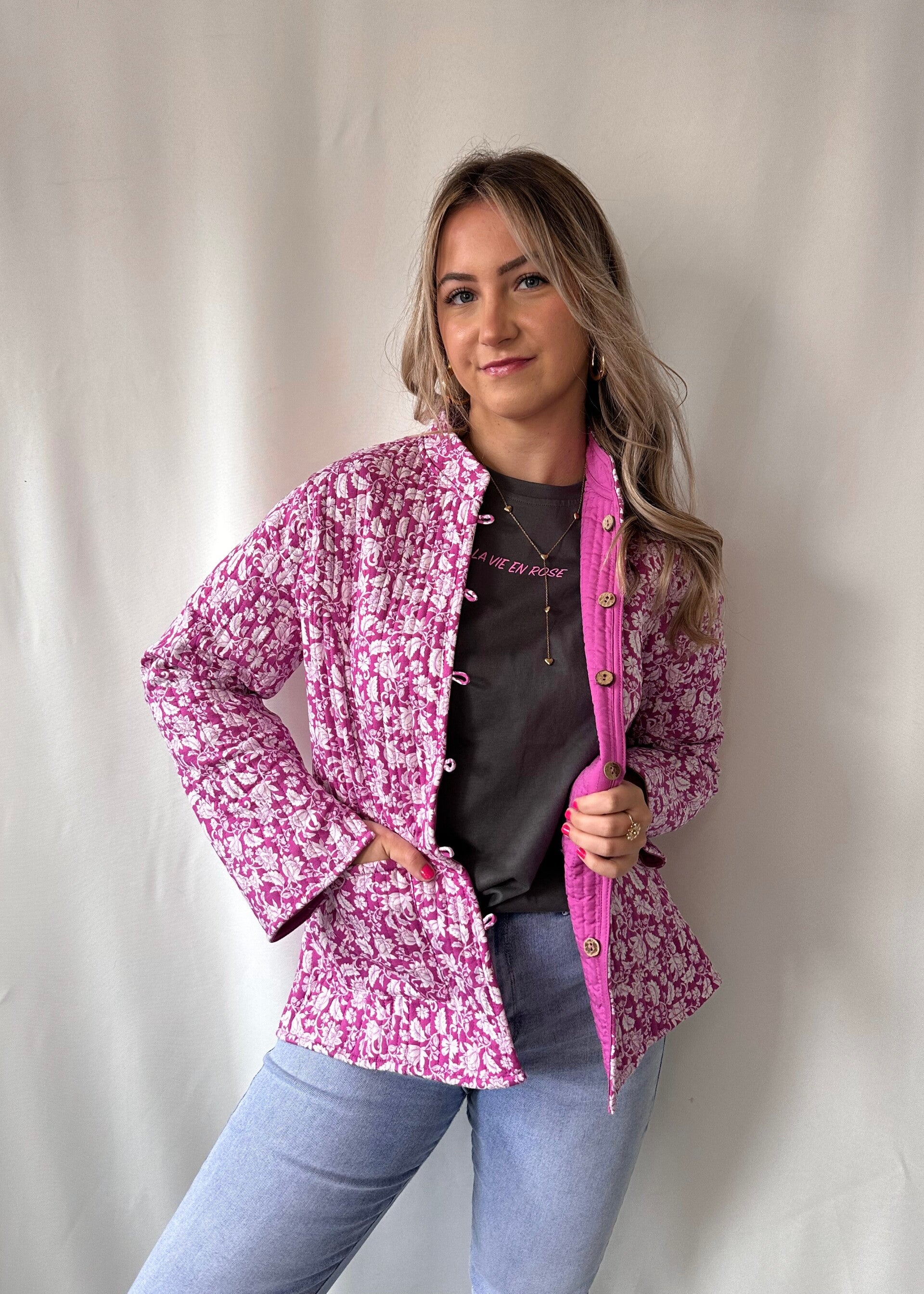 Hoe mega leuk is dit jasje! We love it! De perfecte jas voor de lente! Je kunt het jasje op twee manieren dragen, zowel de roze kant als het bloemprintje. Tipje van ons is wel even de labeltjes eraf halen.
