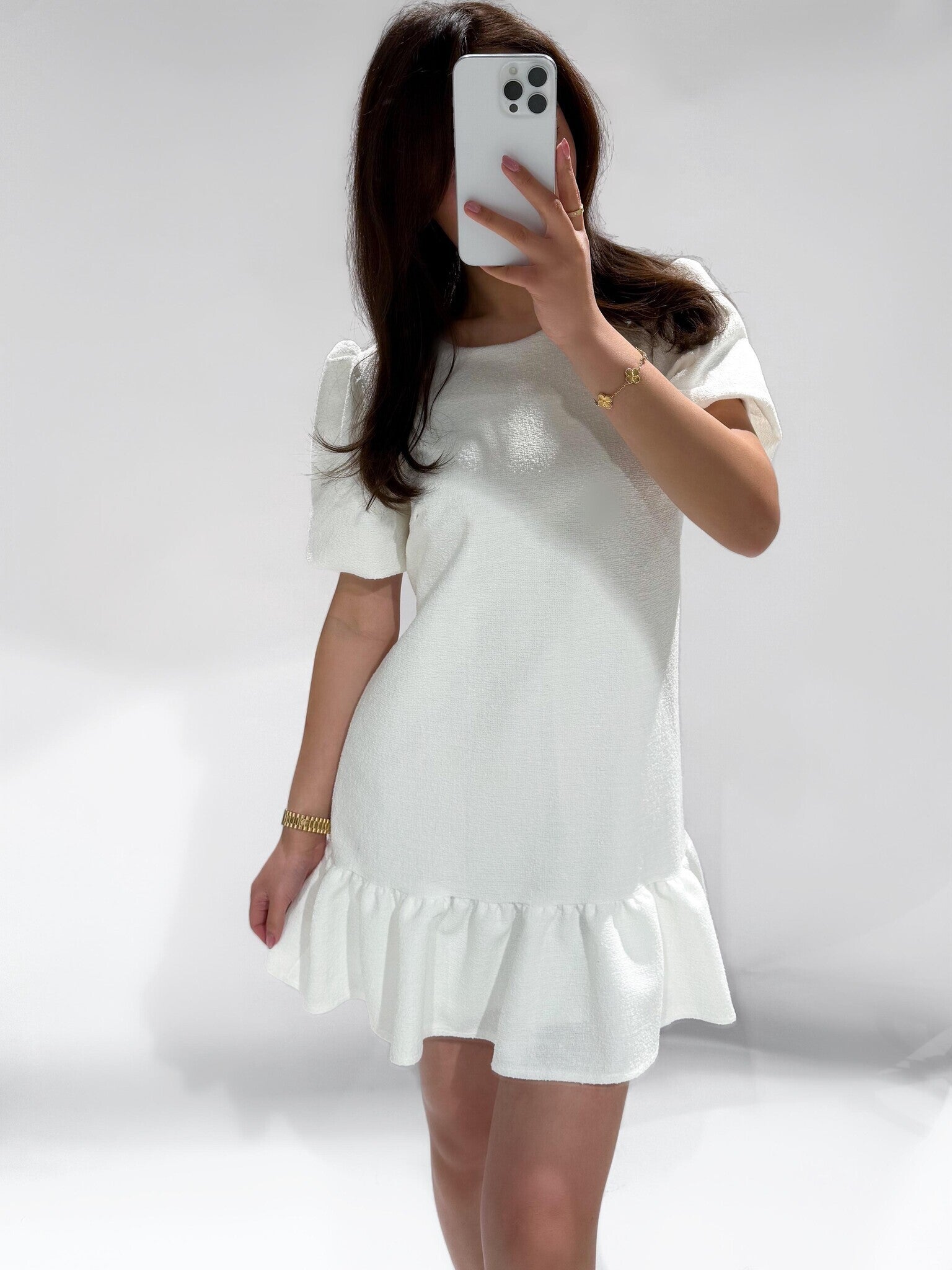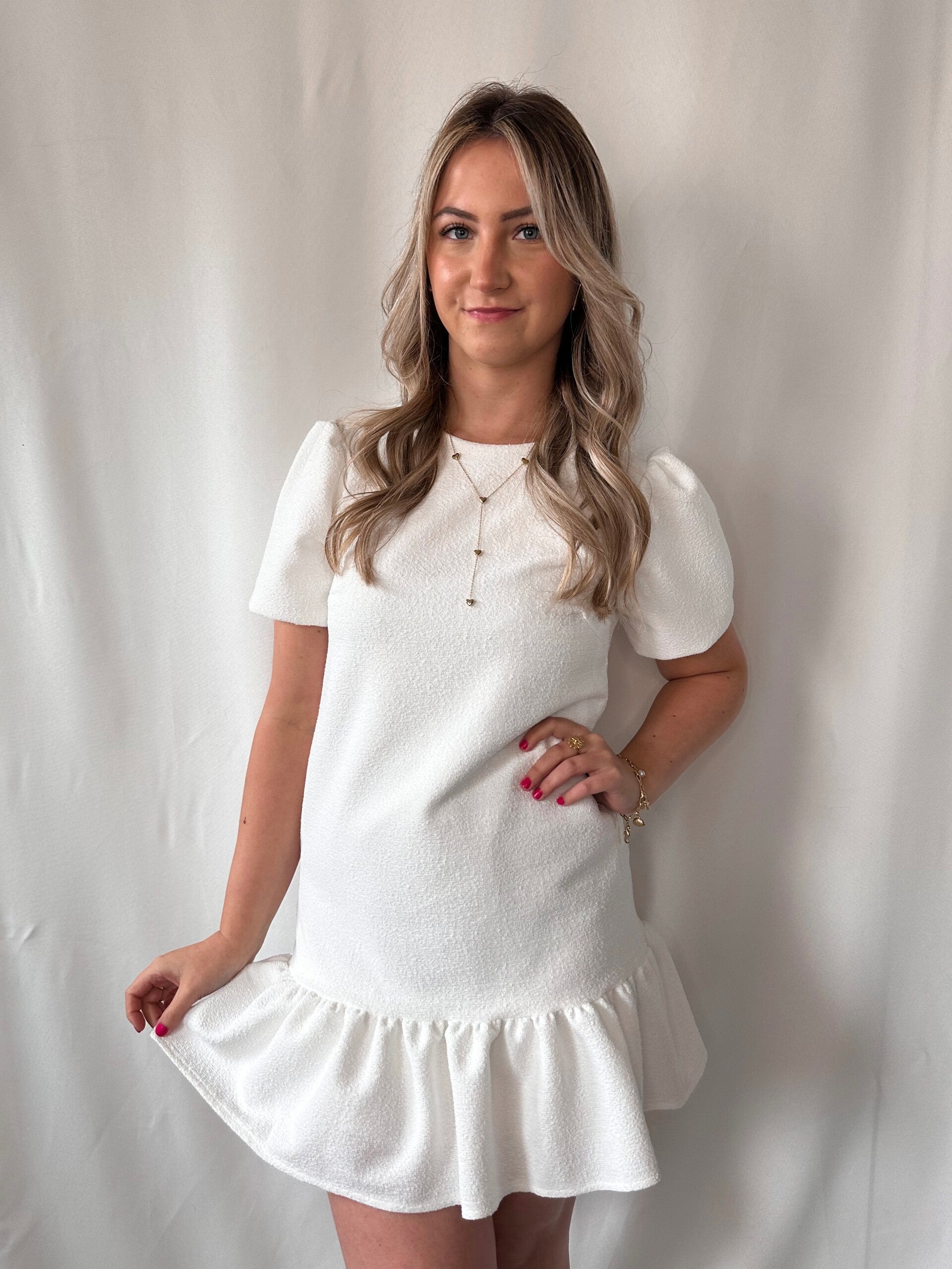 Hoe cute is dit jurkje! Het heeft een prachtige tweed stof waardoor de jurk heel chique eruit ziet. De mouwen zijn korte pofmouwtjes. De jurk is gevoerd waardoor hij niet doorschijnt!