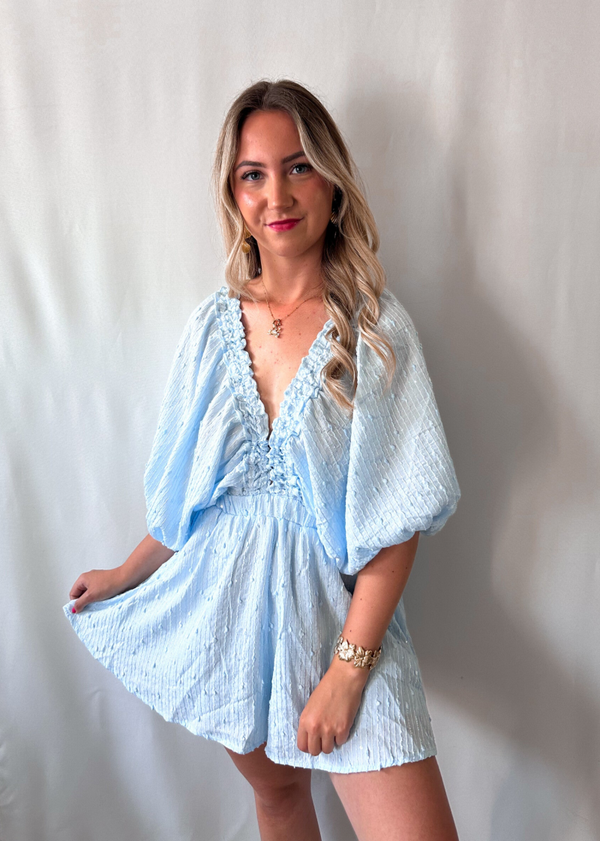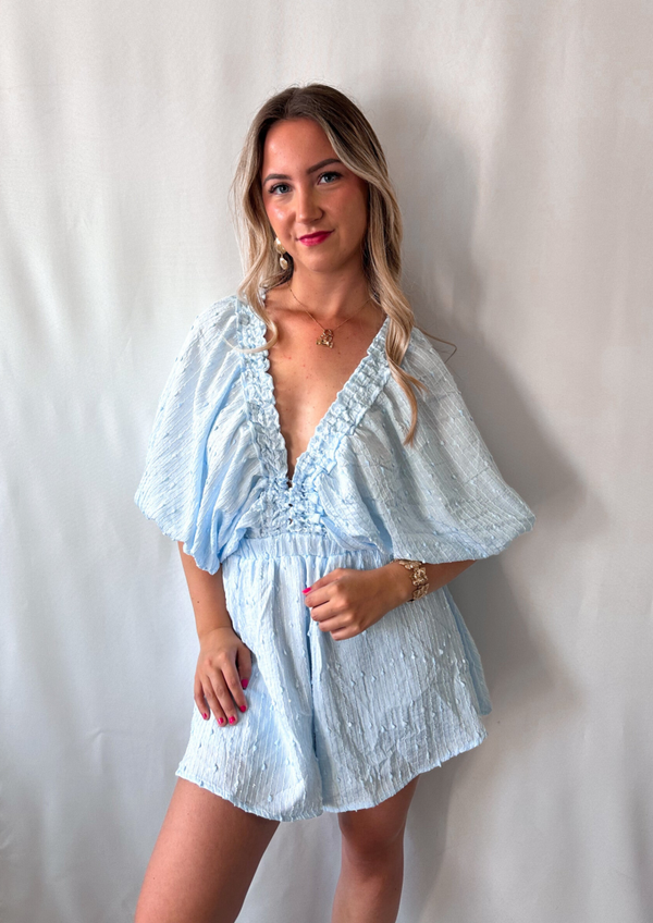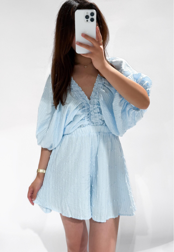 Hoe mega schattig is dit leuke playsuitje! Echt heel trendy momenteel ook! Aan de voorkant bij de borst zit nog een klein sluitinkje. De stof is lekker luchtig en heeft een kleine glitter erin. De mouwen zijn driekwart en het broekje is gevoerd waardoor het niet doorschijnt!